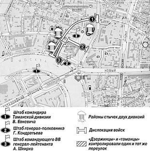Командиру Таманской дивизии генерал-майору Евневичу В.Г. была поставлена задача занять позиции на Краснопресненской набережной, включая переулок Глубокий от Рочдельской улицы до набережной. При этом по приказу министра обороны генерала армии Грачева П.С. на бэтээрах дивизии были размещены вооруженные автоматами добровольцы - ветераны афганской войны.
