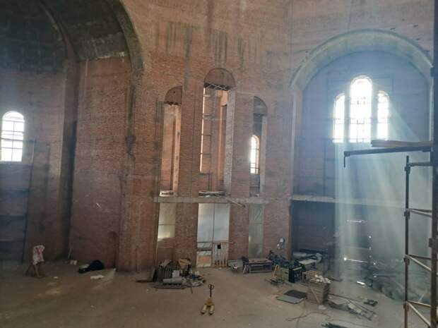 За это время удалось полностью завершить внешнее строительство храма. Когда мы приехали, с храма снимали леса после военной реставрации. Внутри храм не отделан. Несмотря на это, едва переступив порог строящегося храма, чувствуешь его великолепие и величие. Говорят, что это самый большой храм в честь Покрова Божией Матери в России.